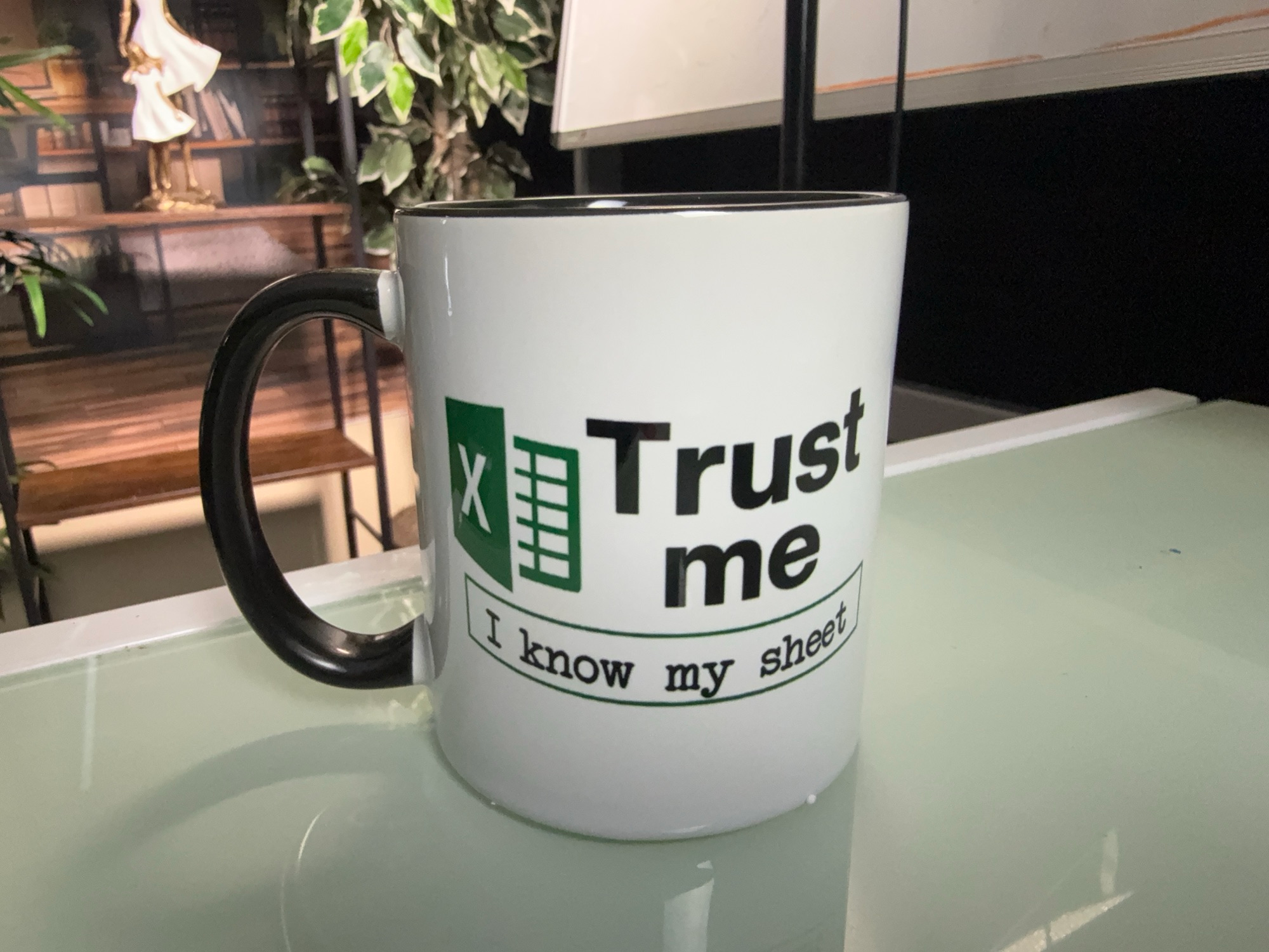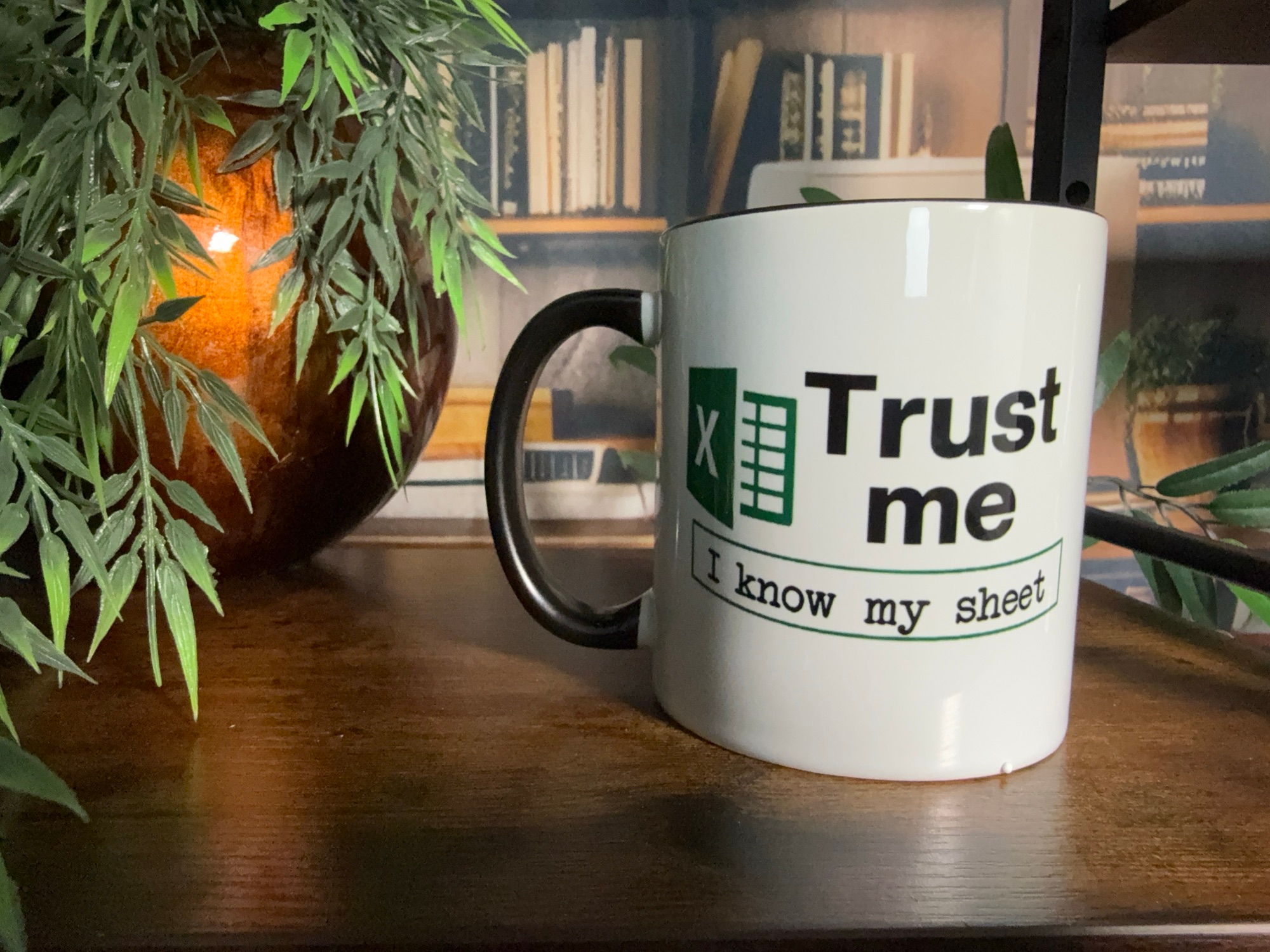 Get this classic Excel mug with the bold statement:“Trust me, I know my Sheet” this mug is made for the masters of formulas, pivot tables, and conditional formatting wizardry. Great gift mug!